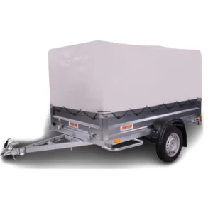 Neptun N7-236 RT o wymiarach 236x129x40 cm z DMC 750 kg, przyczepa wyposażona w stelaż i plandekę o wysokości 80 cm w zestawie z dwoma pasami.